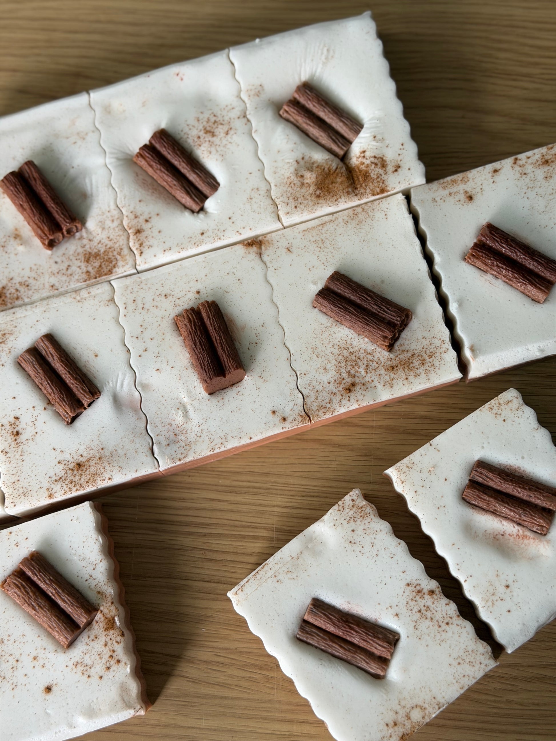 Each bar is finished with a touch of cinnamon for a rustic, artisanal look.