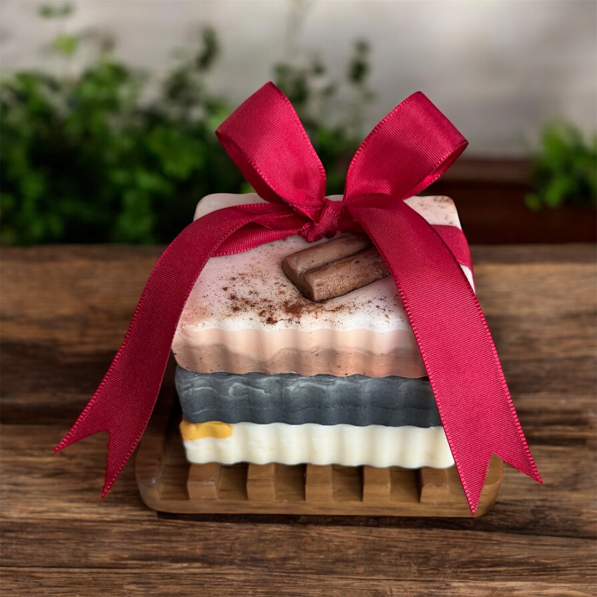 Elevate their daily routine with The Artisan Soap Tower, a stunningly beautiful and ready-to-gift. This set features three unique, handcrafted soap bars, stacked and tied with a luxurious satin ribbon, resting perfectly on a genuine wooden soap dish.